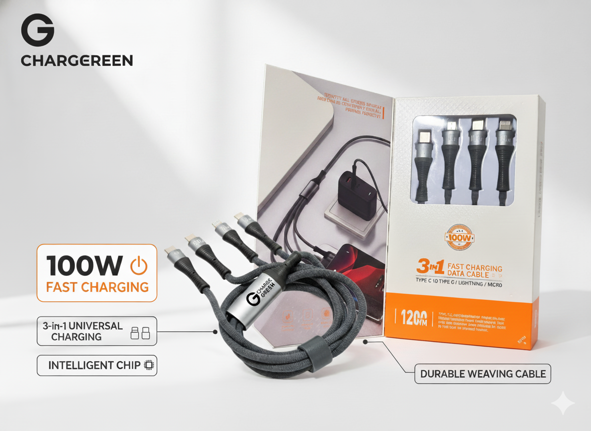 Charge multiple devices with one cable! The ChargeGreen 3-in-1 Universal Cable features 100W fast charging, an intelligent chip for smart device detection, and a durable weaving design for longevity. Compatible with Type-C, Lightning, and Micro USB devices.